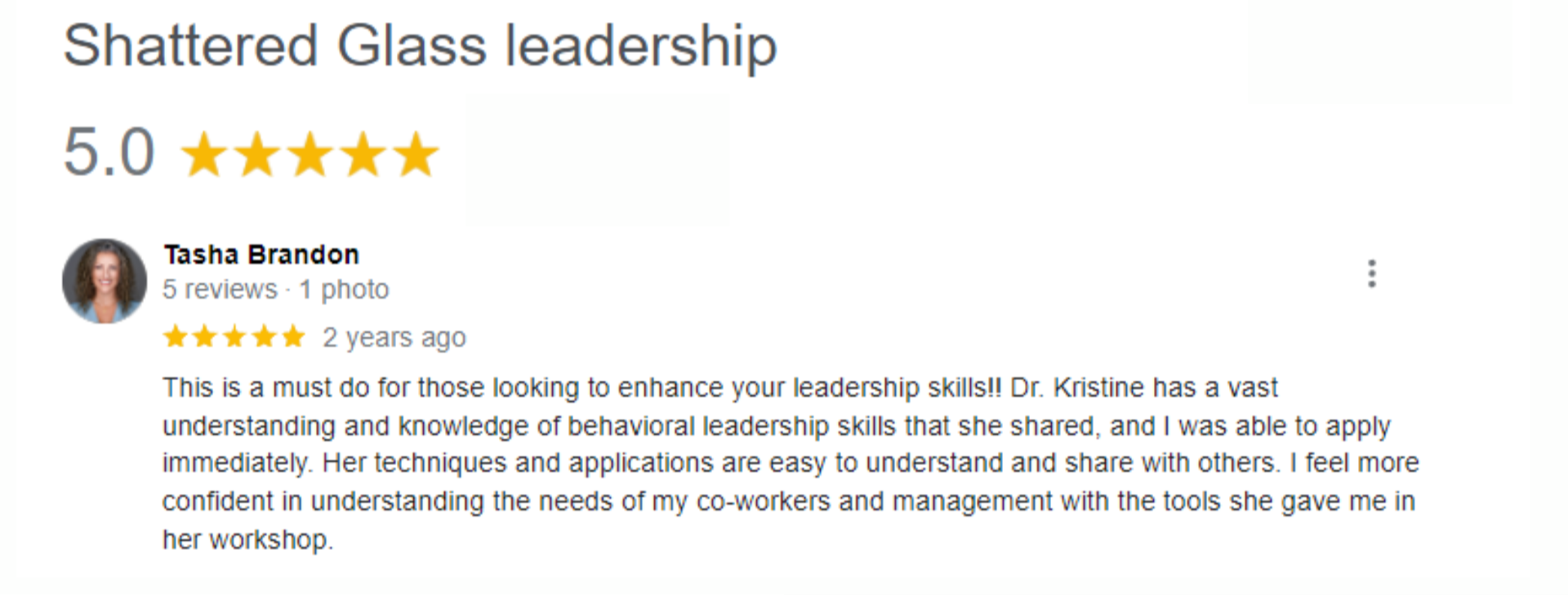 "I recently attended the Weekend Leadership Retreat with Shattered Glass Leadership. Wow! As a small business owner I gained so much perspective about myself as a leader and the team I lead. Dr Kristine’s methods are approachable and her research is sound. I feel like I really gained a lot of opportunities to reflect and grow and I was able to bring back what I learned into my business immediately. There’s a unique and extremely beneficial way the topics are presented that kept me interested all weekend! I highly recommend this retreat experience. I grew up as a woman AND as a leader! I can’t wait to do more with Shattered Glass!!!"